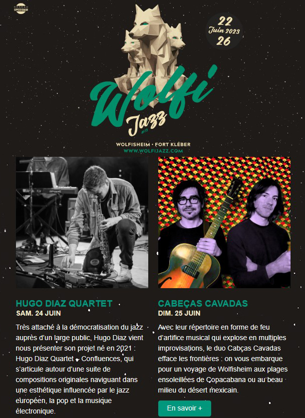 Les 24 et 25 juin, au Festival WolfiJazz, nous aurons la chance de voir sur scène « Hugo Diaz Quartet » et le superbe duo « Cabeças Cavadas »