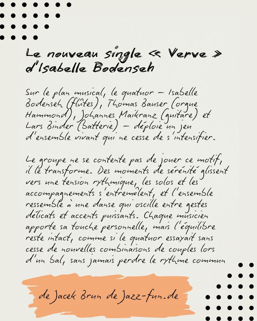 Isabelle Bodenseh est une flûtiste polyvalente qui évolue dans les genres jazz, rock, classique et musique du monde. Elle dirige le quartet ISABELLE BODENSEH, dont l’album actuel « Flowing Mind » (GLM) témoigne de manière impressionnante de son éventail musical.