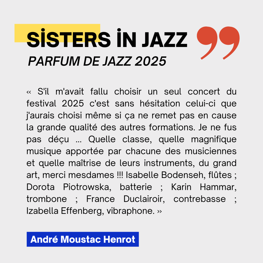 De grandes musiciennes, toutes à la tête de leurs propres projets et originaires des quatre coins de l’Europe, créent une expérience musicale aussi variée que chacune de ces femmes. Sans œillères, elles intègrent des éléments de jazz moderne, de latin, de funk et de rock, ainsi que des influences mélodiques de la musique classique et de leurs pays d’origine respectifs, ce qui donne naissance à un son frais et unique – une véritable musique du monde !