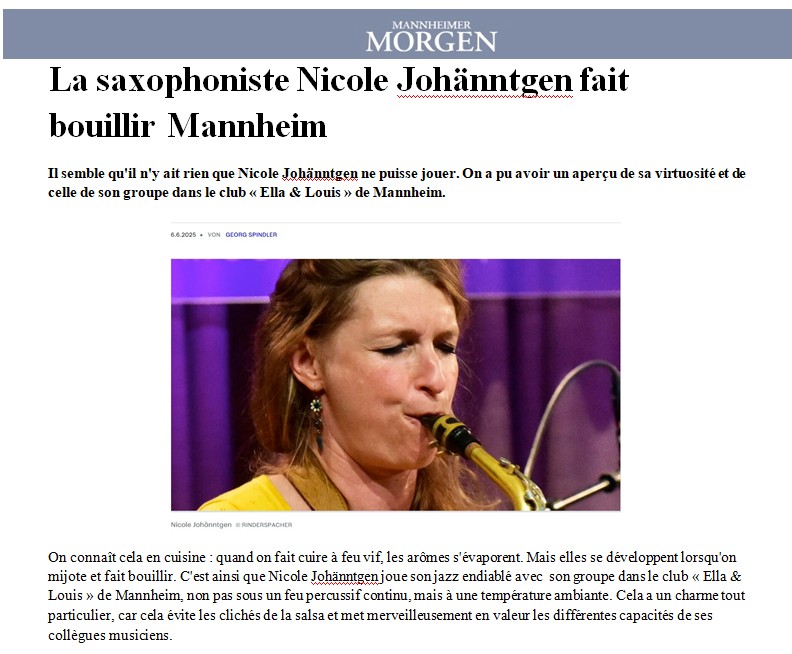 « Il semble qu’il n’y ait rien que Nicole Johänntgen ne puisse jouer. On a pu voir un aperçu de sa virtuosité et de celle de son groupe dans le club « Ella&Louis » de Mannheim » – Georg Spindler le 06/06/2025 pour le Mannheimer Morgen.